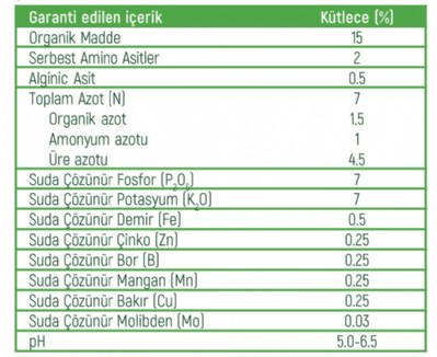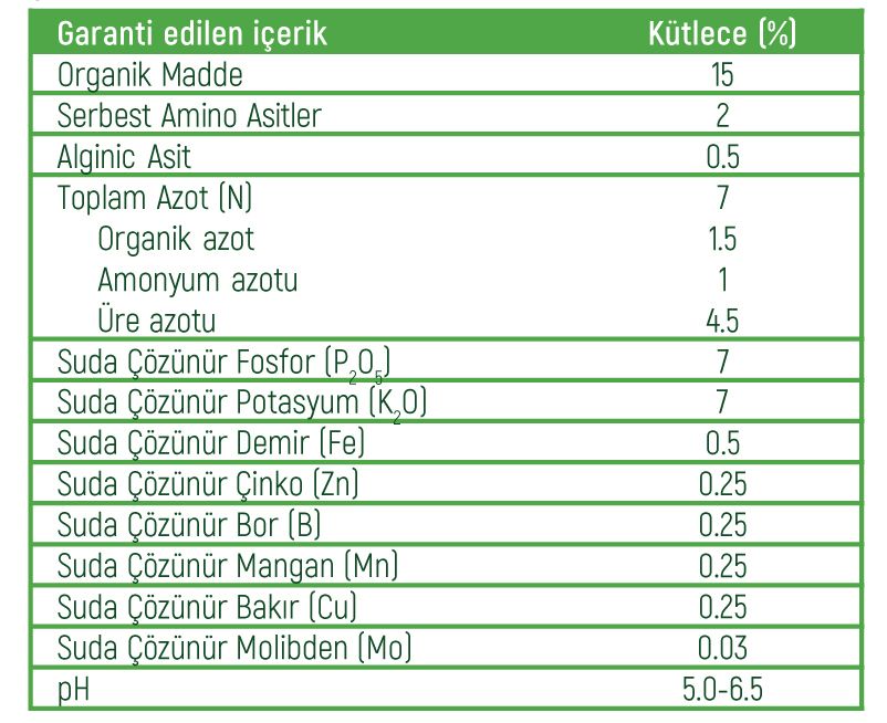 Organik madde, alginik asit ve serbest amino asitlerce zenginleştirilmiş, bitkilerin ihtiyaç duyduğu hemen hemen tüm bitki besin elementlerini içeren NPK’lı sıvı organomineral bir gübredir